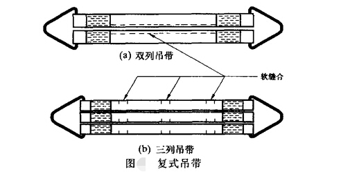 ③復(fù)式吊帶:由兩條或多條寬度相同并排放置的帶子構(gòu)成的吊帶。兒條帶子共有一個末端件,各條帶子的邊緣相互連接。