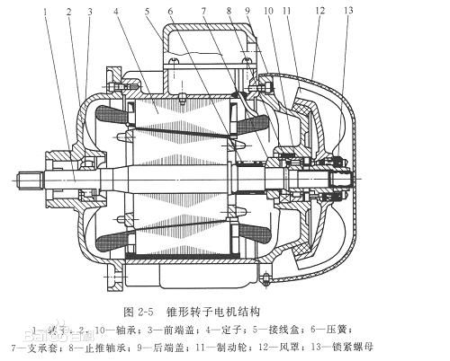 錐形轉子電動機的制動裝置由套在電機轉子上的制動彈簧、風扇制動輪和端蓋上的制動環(huán)組成。電動機運行時,錐形轉子電動機的氣隙磁場產(chǎn)生軸向磁拉力,壓縮制動彈簧,使風扇制動輪與電機端蓋上的制動環(huán)脫開,電機能自由轉動。斷電時,軸向磁拉力消失,轉子在制動彈簧的推力下產(chǎn)生軸向移動,使風扇制動輪壓緊制動環(huán),產(chǎn)生摩擦力,迫使電機迅速停轉并綁住轉子,以防止起吊的重物下落,保障安全。