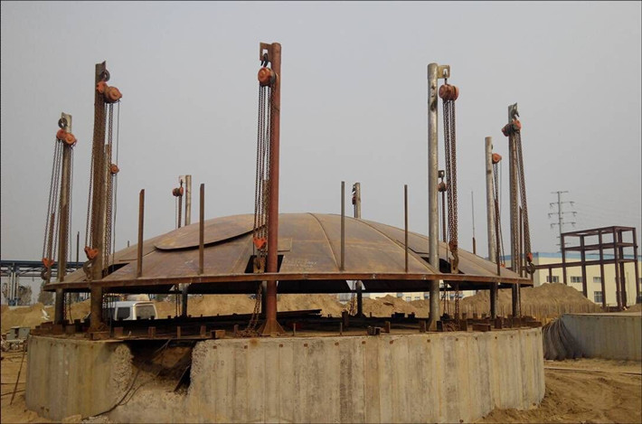 在焊接油罐的第一步就是需要對油罐的整體重量有正確的計(jì)算,一般選定電動(dòng)葫蘆的總額定重量為油罐整體重量的1.3-1.5倍以上。確定焊灌電動(dòng)葫蘆臺數(shù)后,要精確計(jì)算和確定吊點(diǎn)的間距,個(gè)各吊點(diǎn)間距一定要相等且均衡布點(diǎn)。由于施工工藝上要求少開天窗,因此首先吊點(diǎn)要盡可能少,除要求首次吊點(diǎn)的間距一致外,還要考慮以后吊點(diǎn)的均衡設(shè)置,以保持各吊點(diǎn)的間距相等,盡可能為電動(dòng)葫蘆的均載運(yùn)行創(chuàng)造條件。根據(jù)以往的施工經(jīng)驗(yàn),首次吊點(diǎn)一般為選定電動(dòng)葫蘆總臺數(shù)的一半,第二次吊裝施工完畢后,即在吊裝第三層前要及時(shí)補(bǔ)進(jìn)其余所有吊點(diǎn)立柱,掛上整套焊灌電動(dòng)葫蘆,全部投入第三層的吊裝運(yùn)行。