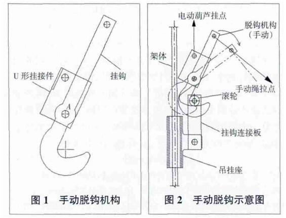 手動(dòng)脫鉤工作原理。如圖2所示,掛鉤通過(guò)滾輪把架體鉤住,電動(dòng)葫蘆通過(guò)U形連接件連接,把架體吊掛在附著處,當(dāng)掛鉤被人用繩索拉動(dòng)并繞A點(diǎn)轉(zhuǎn)動(dòng)時(shí),掛鉤下部圓弧逐步速脫開(kāi)滾輪,脫開(kāi)后架體失去支承而墜落。