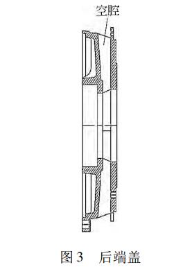 當(dāng)電機(jī)質(zhì)心變化時(shí),吊環(huán)螺釘可以跟著移動(dòng),只需用緊定螺釘將吊環(huán)安裝板固定在合適的位置,還優(yōu)化就可以確保吊環(huán)螺釘總是在電機(jī)的質(zhì)心處,使電機(jī)在吊裝時(shí)總是平衡的。冷卻風(fēng)可以通過通風(fēng)口流通,不會(huì)被電機(jī)接線盒阻擋,可以有效降低出線盒處的溫度。U形槽的作用: 電機(jī)的端蓋與機(jī)座通過雙頭螺桿固定,U形槽4個(gè)均布,可以固定雙頭螺桿的位置,同時(shí)又起到散熱片的作用,既不增加機(jī)座的質(zhì)量又可以增加機(jī)座的散熱面積。帶繞組定子鐵芯采取熱套工藝,同時(shí)通過緊定螺釘孔固定,保證電機(jī)能夠頻繁正反轉(zhuǎn)。定子采取外止口加工工藝,主要可以保證定子的氣隙同軸度。通過試驗(yàn)驗(yàn)證,增加了機(jī)殼散熱面積后電機(jī)的溫升下降了23 K,電機(jī)的振動(dòng)及噪聲都非常小。由于電動(dòng)葫蘆的工況決定了電機(jī)可能頻繁制動(dòng),因此,設(shè)計(jì)了一種特殊的后端蓋,如圖3所示,將制動(dòng)器摩擦面和軸承隔開,可以避免頻繁摩擦導(dǎo)致熱量直接傳遞到軸承將軸承燒毀。