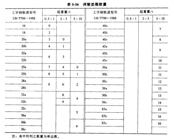 3、由于廠房跨度大小不一,選用工字梁軌道大小不同,因此走輪組件在安裝時(shí)應(yīng)隨工字梁軌道的寬度,用調(diào)整墊圈進(jìn)行調(diào)整(見(jiàn)圖5.48),調(diào)整墊圈數(shù)量如表5.56所示。