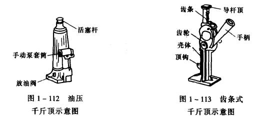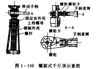 棘輪手柄由棘輪、棘輪卡、手柄套筒組成。還有一種傘齒輪式螺旋千斤頂,如圖1-111所示。扳動操作手柄,經(jīng)過傘形齒輪傳動,將千斤頂升起,這種千斤頂上還裝有一個換向扳鈕,可控制千斤頂?shù)纳蛯ⅰB菪皫讍尉凶枣i作用,所以重物不會因停止操作而突然下降,也無漏油等故障問題,維護保養(yǎng)也較方便,能在垂直、橫臥或倒放等幾種位置狀況下使用。使用的有5、10、15、30、50t等規(guī)格。手柄操作力有十多公斤到幾十公斤不等,由1-3人操作。