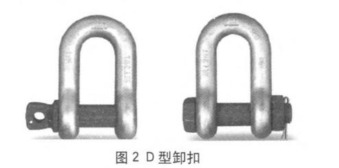 如圖2、3所示,在起重吊裝索具中,卸扣屬于連接件。一般起重用的D型和弓型卸扣均由鍛造制成。卸扣由扣體、銷軸等易拆卸的零件裝配成的組合件,由圖2、3可知,左側(cè)卸扣的銷軸為w型帶孔和抬肩的螺紋銷軸,右側(cè)卸扣的銷軸為X型六角頭螺栓型銷軸,并配有六角螺母和開口銷。兩種形式的卸扣安裝時,均需先將銷軸穿人卸扣本體左側(cè)環(huán)眼至另一端,W型直接擰入卸扣本體緊定,X型需將螺母旋緊緊定或插開口銷緊定。卸扣裝卸時,均需作業(yè)人員雙手操作,且均需要一定的緊定或拆卸時間。