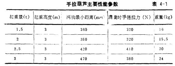 手扳葫蘆比手拉葫蘆及環(huán)鏈電動(dòng)葫蘆都輕巧。一般手拉葫蘆的安全系數(shù)n=2,但手扳葫蘆的安全系數(shù)廠家提供n》5。手扳葫蘆的另一有點(diǎn)是提升的高度不受限制,鋼絲繩的長(zhǎng)度可作調(diào)整。圖4-51為手扳葫蘆外形,表4-3列出手扳葫蘆的主要性能。