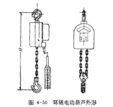 環(huán)鏈電動(dòng)葫蘆是近幾年發(fā)展起來(lái)的小型輕便提升工具。它的主要特點(diǎn)是體積小,自重輕,操作靈活,可代替手拉葫蘆,特別是能實(shí)現(xiàn)多臺(tái)集中控制,節(jié)省勞動(dòng)力。環(huán)鏈電動(dòng)葫蘆的外形如圖4-50