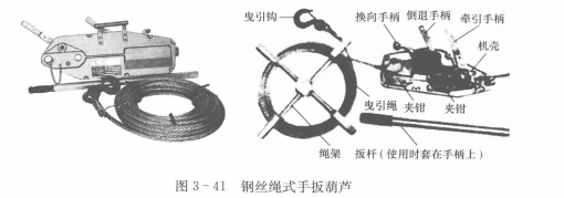 2、鋼絲繩式手扳葫蘆。鋼絲繩式手扳葫蘆(見圖3-41),又稱橫向牽引機(jī),它不但能作一般牽引、卷揚(yáng)、起重工作。而且還能在傾斜高低不平的狹窄地帶和曲折轉(zhuǎn)彎的條件下進(jìn)行工作。