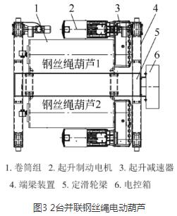 采用4/2倍率繞繩方式,由于第一層鋼絲繩與第二層鋼絲繩在卷筒上有高低差(即鋼絲繩直徑差),卷筒轉(zhuǎn)動(dòng)時(shí),上下兩層鋼絲繩進(jìn)出繩速度會(huì)不一致,因此,通過增加一個(gè)平衡滑輪,調(diào)整繩速,使起吊平穩(wěn),解決了以往2臺(tái)電動(dòng)葫蘆并聯(lián)時(shí)容易出現(xiàn)的出繩和入繩不同步的現(xiàn)象,提高了鋼絲繩電動(dòng)葫蘆的使用壽命。