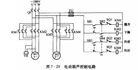 主電路用斷路器QF作短路保護,接觸器KM1、KM2控制提升電動機M1,KM3、KM4控制行進電動機M2的正反向運行,它們都是靠改變施加于電動機三相電源的相序,實現(xiàn)正轉或反轉的,YB為電磁制動器,它裝在提升電動機M1的端部,以保證吊鉤的準確定位。