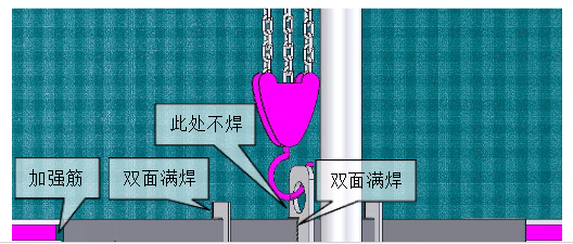 脹圈用槽鋼滾弧制成,曲率半徑與儲罐內(nèi)徑相同。在電動葫蘆正下方的脹圈上焊接吊耳。此處需特別注意,脹圈吊耳兩側(cè)各一米左右需采用加強筋與加強版加固,吊耳只與脹圈焊接,不得將吊耳與罐壁相焊,以免提升時電動葫蘆的傾角拉力造成罐壁下側(cè)向內(nèi)受拉變形。脹圈與罐壁使用龍門卡具相連,龍門卡具的位置不得靠吊耳過近,太近容易造成罐壁受拉變形,也不得離吊耳過遠,過遠會造成脹圈受扭轉(zhuǎn)力過大而變形。