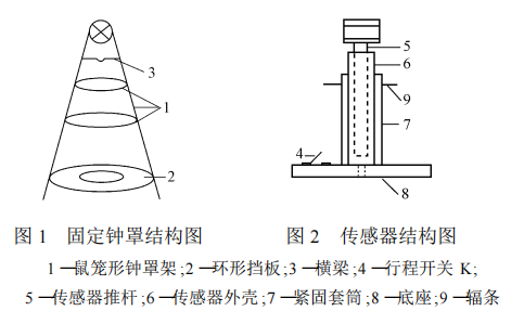 傳感器外殼固定在套筒上,底座則與套筒固定在一起、三者連為一體。設置環(huán)形擋板和輻條是因為在電動葫蘆制動后,底座和重物砣由于受到自身重力的作用,必然要下滑一段距離,當?shù)鬃禄絺鞲衅魍茥U端部時,輻條碰住環(huán)形擋板上表面,底座停止下滑,這樣可避免將推桿從傳感器外殼中拉出。同時,環(huán)形擋板還起著在底座上升時閉合行程開關的作用。因此,環(huán)形擋板和輻條的安放位置十分關鍵。環(huán)形擋板的位置應保證在測試過程中重物饦推動底座上升到行程開關碰住環(huán)形擋板底部時,傳感器端部與底座之間仍有一微小距離,這樣就防止了底座撞擊傳感器端部而損壞傳感器。輻條的位置應保證底座下滑到碰到環(huán)形擋板時,推桿剛好到達傳感器大位置且未從外殼中拉出。