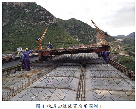 該軌道回收裝置用于鋼混橋梁架橋機(jī)架設(shè)完畢后,架橋機(jī)的軌道回收,利用旋轉(zhuǎn)中心軸、第一旋轉(zhuǎn)托盤和第二旋轉(zhuǎn)托盤可實(shí)現(xiàn)吊具的360毅旋轉(zhuǎn)作業(yè),作業(yè)方便快捷,使用安全可靠,操作易控制,自重輕、施工快速,避免了物品回收時的人工轉(zhuǎn)運(yùn)時耗,有利于施工成 本的節(jié)約?;喌蹉^裝置通過定滑輪、起吊電動葫蘆和 鋼絲繩作用,可實(shí)現(xiàn)架橋機(jī)軌道的高效回收。與現(xiàn)有技術(shù)相比,該應(yīng)用于鋼混橋梁安裝架橋機(jī) 軌道回收裝置的設(shè)計(jì)結(jié)構(gòu)簡單、使用方便快捷、安全可靠、易控制和成本低,采用該回收裝置規(guī)避了傳統(tǒng)人工進(jìn)行軌道回收的耗時且效率低下問題;提升了架橋機(jī)軌道回收的效率;規(guī)避了人工回收軌道的安全隱患;快捷方便且縮短了鋼混橋梁的架設(shè)工期。