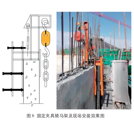(1)用塔吊將固定夾具騎馬架、電動葫蘆吊裝到檐溝操作平臺作業(yè)面處。固定夾具騎馬架騎扣在倉壁鋼牛腿預(yù)埋件的正上方。在每個固定夾具騎馬架馬頭上掛鉤孔掛 1 個 6.8T 電動葫蘆,本項(xiàng)目共設(shè)計(jì)26個,其數(shù)量依據(jù)為荷載:桁架23.58T+模板、鋼管、扣件、施工荷載 15.78T=39.36T ;電動葫蘆起重荷載6.8T,葫蘆荷載減半計(jì)算為3.4T,39.36/26=1.52T,所以選擇 26 個 6.8T 的電動葫蘆足以滿足施工要求(見圖6)。