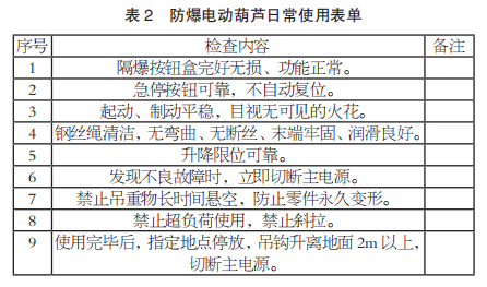 電纜滑車(chē)的滾輪材料:防爆電動(dòng)葫蘆電纜滑車(chē)的滾輪使用工程塑料材料,避免因摩擦產(chǎn)生火花。防爆電動(dòng)葫蘆使用:按照防爆電動(dòng)葫蘆日常使用表單(見(jiàn)表 2)進(jìn)行檢查和使用,確保了安全生產(chǎn)。