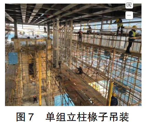 單組鋼立柱椽子的吊裝:單組椽子通過轉(zhuǎn)運(yùn)車運(yùn)至安裝位置,電動葫蘆緩緩吊起構(gòu)件,然后操作電動葫蘆垂直運(yùn)至安裝位置,操作工站在支架上安裝構(gòu)件。為減少電動葫蘆提升時間,4 名操作工人同時站在4個角部進(jìn)行螺栓安裝作業(yè)。構(gòu)件與桁架下懸桿連接鋼板通過高強(qiáng)螺栓進(jìn)行連接,通過雙向全站儀的復(fù)測,調(diào)節(jié)螺栓墊片調(diào)整立柱的垂直度。圖7單組立柱椽子吊裝如圖7所示,在單組構(gòu)件起吊過程中,上、下作業(yè)層的安裝人員應(yīng)協(xié)調(diào)一致,特別是上一層的安裝人員應(yīng)注意構(gòu)件吊裝過程中的垂直度和角度,防止單組構(gòu)件在起吊過程中碰撞支架,也防止吊裝過程中吊帶摩擦屋頂主橫梁,下層作業(yè)人員不應(yīng)在吊裝作業(yè)范圍下活動,同時注意上方墜落物品,禁止其他無關(guān)人員通行。