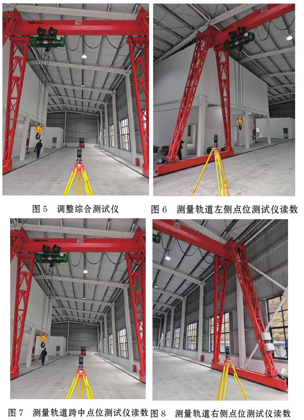 司,該設(shè)備于2023年5月19日校準(zhǔn),設(shè)備正常。面對主梁,放置綜合測試儀,調(diào)整水平(圖5)。將電動葫蘆運(yùn)行至左側(cè)接近支腿處,露出軌道端部便于后續(xù)測量。