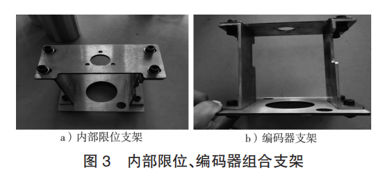 為了滿足在緊湊的環(huán)鏈葫蘆殼體內(nèi)部加裝機(jī)械限位開關(guān)、編碼器的需求,需要根據(jù) ABUS 環(huán)鏈葫蘆自帶原裝限位開關(guān)的外觀尺寸以及編碼器的安裝尺寸來設(shè)計加工固定支架。支架部件間采用可調(diào)節(jié)連接方式,立支架兩側(cè)開挖空檔,便于人工手動調(diào)整限位開關(guān)。內(nèi)部限位、編碼器組合支架如圖 3 所示。