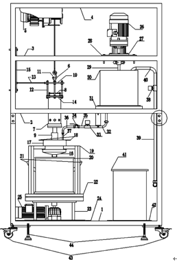 攪拌裝置,就是在第三層支架3的右側有一臺攪拌電機26,攪拌電機26豎直倒立放置。將攪拌電機的法蘭27用螺絲固定在支架層3上的架板28上。在攪拌電機26的旋轉軸上接攪拌器29,攪拌電機26正下方有一個圓柱形儲水桶30,攪拌器29需能夠伸入到儲水桶30中,儲水桶30被螺絲固定在第二層支架2右側的架板31上。儲水桶30底部有一出水孔,鋼制水管32成90度,其一端連接在該孔,另一端與電磁閥33的一端相連,電磁閥33的另一端與止水閥門34的一端用鋼制水管35相連。鋼制水管36成90度,其一端與止水閥門34的另一端相連,鋼制水管36的另一端與軟水管37的一端相連,軟水管37的另一端需能夠伸入到漏斗無底圓柱形水桶18中。支架右側有一進水管39,進水管39一端接水源,另一端接電磁閥38的一端,電磁閥38的另一端與U形水管40的一端相連,U形水管40的另一端伸入到儲水桶30中。