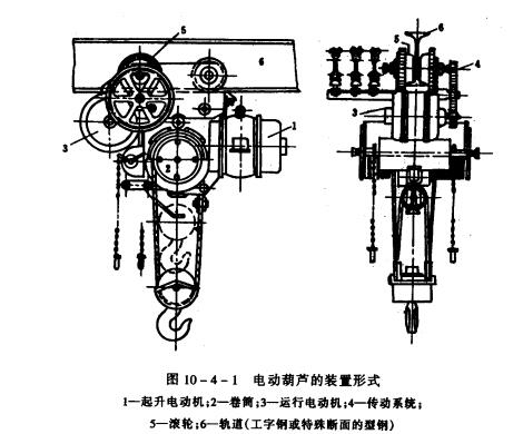 圖10-4-1所示,兩臺電動機各自驅(qū)動其起升機構(gòu),或運行機構(gòu)的鋼絲繩式的電動葫蘆其起升機構(gòu)由電動機、卷筒及其相應的傳動系統(tǒng)所構(gòu)成,運行機構(gòu)則包括電動機,并通過傳動系統(tǒng)與驅(qū)動輪相連,電動葫蘆通常沿工字鋼下翼緣的踏面移動,當然,在有些場合下,還可沿具有特殊斷面的軌道運行。